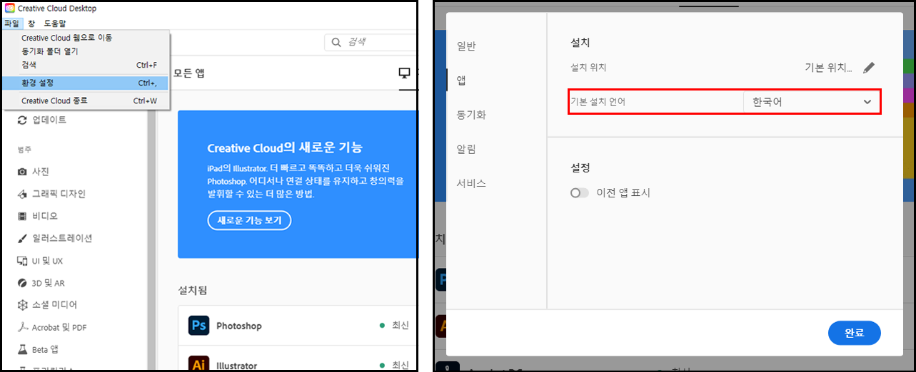 Creative Cloud 데스크탑 앱 - [파일] - [환경 설정] - [앱] - '설치' 부분의 '기본 설치 언어' 옵션