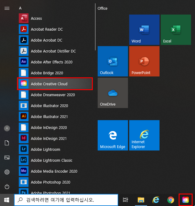 우선 Creative Cloud 데스크탑 앱을 실행합니다. 포토샵이나 프리미어 프로 등의 CC 제품 설치 시 함께 설치되는 프로그램으로 PC에서 확인할 수 있습니다. '검색' 기능을 통해 앱을 실행하거나, PC에서 '무지개색 구름 모양' 아이콘 프로그램을 실행 합니다.