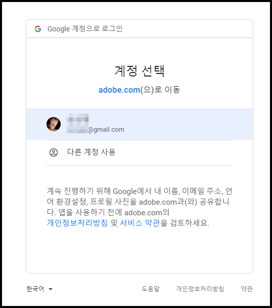 저는 구글 계정 연결을 위해 다음 페이지로 넘어왔습니다. 일반적으로 구글에 로그인하는 화면이 나왔네요. Adobe 계정과 연결할 계정을 클릭하면 간단하게 연동이 완료됩니다.