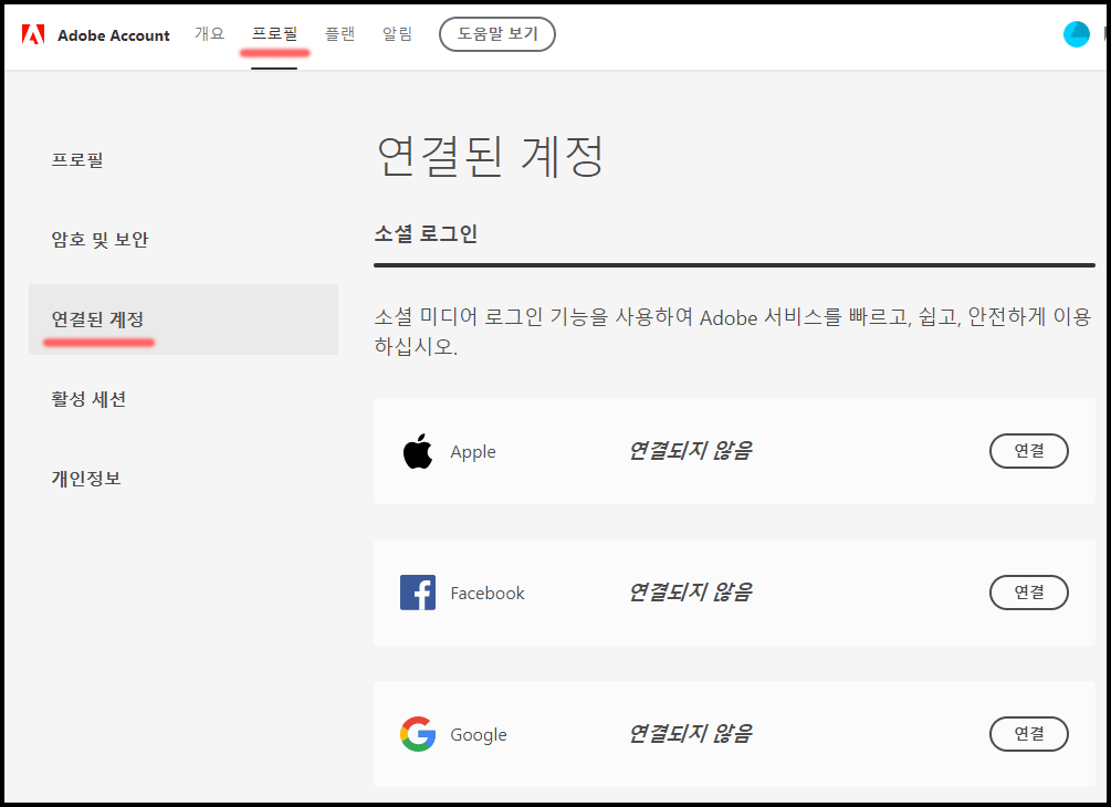 만약, 연동 전 소셜 로그인으로 가입 및 로그인한 적이 있다면 연동이 불가능합니다. 연동하기 전에 소셜 로그인을 하면 Adobe에서는 각 소셜 계정에 암호화된 새로운 계정을 생성합니다. 이 경우 같은 Mail 계정을 사용하더라도, 서로 다른 계정으로 인식하므로 이 점에 주의해야합니다.