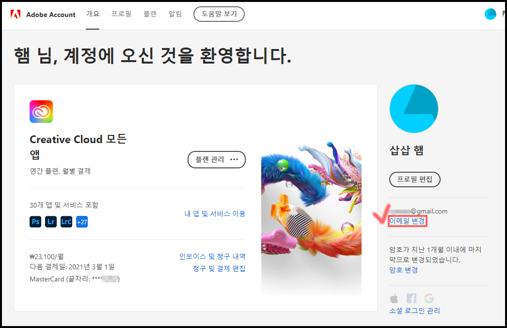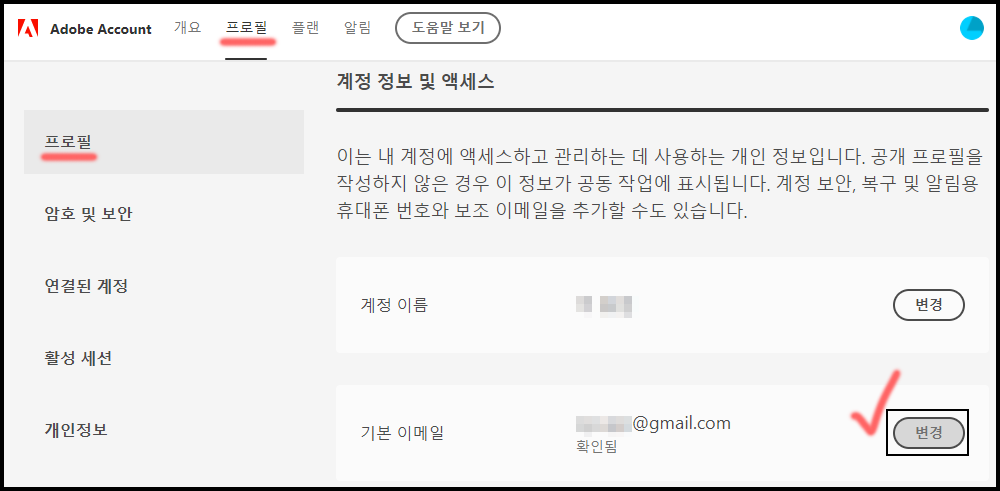 Adobe 공식 홈페이지 >> Adobe 계정 페이지 >> [프로필] >> [프로필] >> [기본 이메일] '변경'