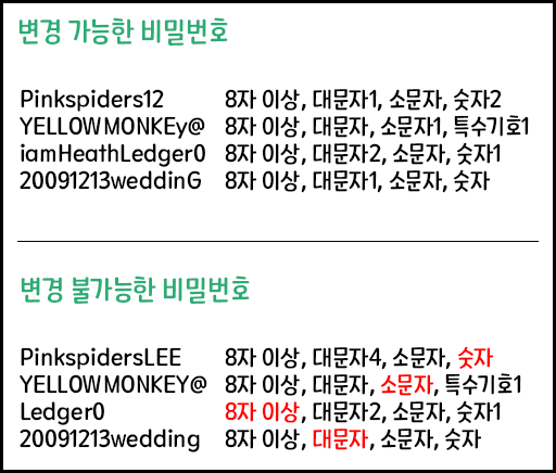 다음에 보이는 암호 변경 페이지에서 현재 암호와 새로운 암호를 입력하면 간단하게 암호 변경이 가능합니다. 새로운 암호는 길이 여덟 자 이상, 최소 하나 이상의 소문자, 대문자의 라틴 문자와 숫자 또는 기호가 포함되어야 합니다. 또한 이전에 등록했던 비밀번호를 재등록하는 것은 불가합니다. 조건이 까다로운 만큼, 이후 분실에 대비하여 기록해 두는 것을 추천드립니다. 아래에 등록 가능한 비밀번호의 예시를 보여드립니다.