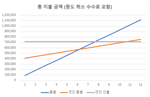 아래는 각 결제 플랜의 이용 시기에 따라 발생하는 이용 금액과 (발생하는 경우) 취소 수수료를 합산한 금액을 도식화한 그래프 입니다. 이용자의 이용 기간에 맞는 지불 플랜을 선택하여 영리하게 이용 바랍니다.
