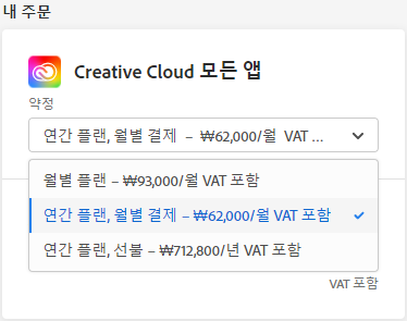 말 그래로 다달이 금액이 지불되는 방식입니다. 다만 연간 플랜과는 달리 계약을 월별로 진행합니다. 즉, 제품 이용 중 위약금 없이 언제든 취소가 가능합니다. 대신 약정이 있는 다른 두 플랜에 비해 비교적 가격이 비싼 편 입니다. 모든 앱을 이용하는 경우 93,000원을 달마다 지불합니다. 연간 월별 플랜이 62,000원인 것에 비하면 약 30프로 정도 비싸므로, 따라서 단 기간 사용 시에는 이점이 있지만, 사용 기간이 길다면 약정이 있는 나머지 두 플랜을 이용하는 것이 좋습니다.