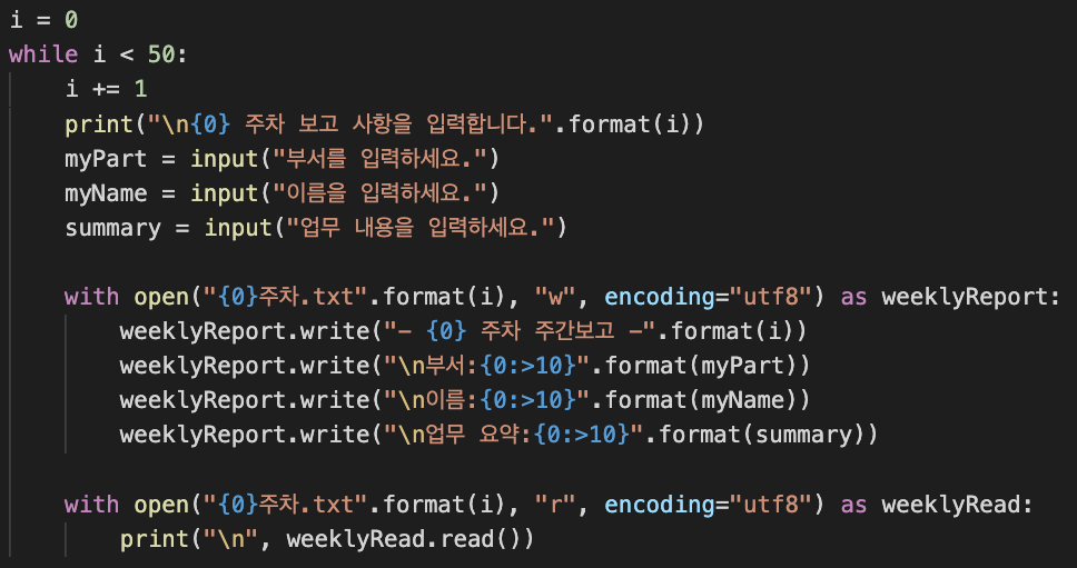 # 반복문이 50회 진행될 동안 계속하여 보고서 내용을 입력받습니다.