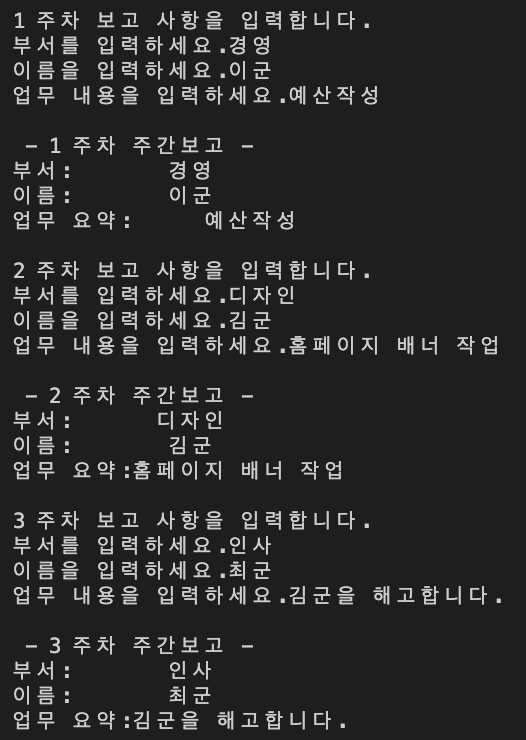 # <input> 함수를 이용해 보고서 내용을 입력받습니다.