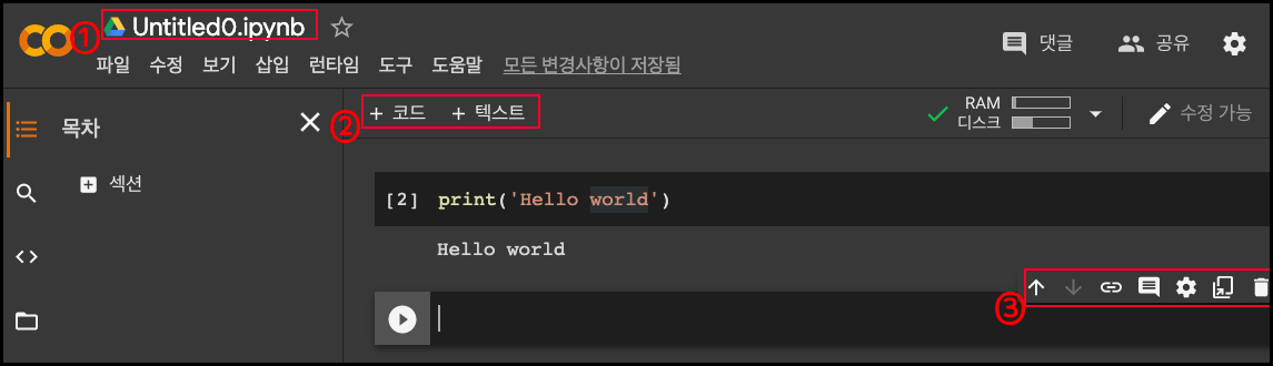 위 이미지에 표시된 Colab의 기능을 간단히 설명하자면,