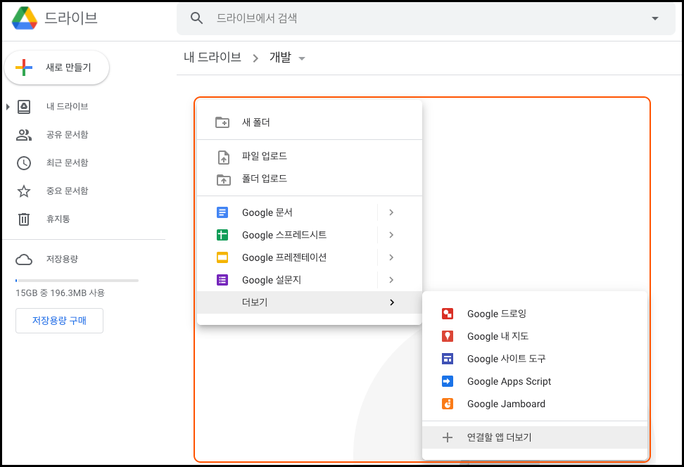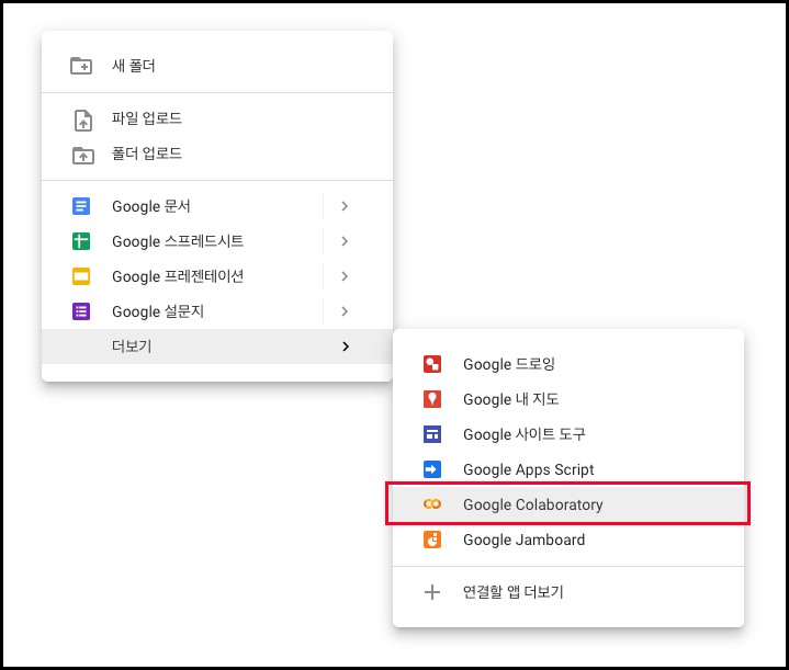 이용 방법은 매우 간단합니다. 구글에 로그인하여 구글 드라이브 서비스 화면으로 이동한 후, 파일을 생성할 경로의 화면위에 마우스를 우클릭하여 Google Colaboratory 파일을 생성해 즉시 이용할 수 있습니다. 최초 파일을 생성하려 할 때, Google Colaboratory가 보이지 않는다면 아래의 사진을 참고해 서비스를 추가할 수 있습니다.