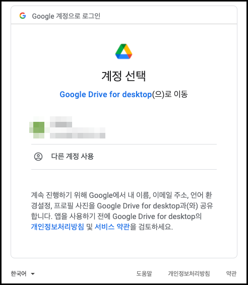 다음 페이지에서는 '어떤 계정의 드라이브'와 연동할 지를 선택할 수 있습니다. 현재 로그인 된 구글 계정이 보이네요. 이 계정의 드라이브를 연동하려면 계정을 클릭해 다음 페이지로 넘어갑니다. 아래의 '다른 계정 사용'을 클릭해 다른 계정의 드라이브에 연동할 수 있는지는 확인해보지 못했습니다만, 옵션이 있다는 건 가능하다고 볼 수 있겠습니다.