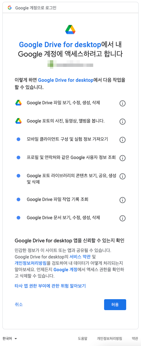 계정을 선택하고 다음 페이지로 넘어가면, 어떤 권한을 허용할 지에 대한 내용이 나타납니다. 다른 사람의 계정을 접근하는 것이 아니라면 자세히 확인할 필요 없이 하단의 '허용' 버튼을 눌러줍니다.