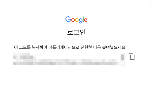 마지막으로 나타나는 페이지에는 접근 허용을 위한 일회용 코드가 나타납니다. 해당 코드를 복사하여 실행 중인 주피터 노트북의 입력창에 붙여넣으면 드라이브에 정상적으로 연동이 완료됩니다. 코드를 복사할 때 우측의 아이콘을 (사각형 두개가 겹쳐있는 아이콘) 눌러 손쉽게 복사할 수 있습니다.