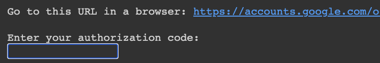 코드를 입력 후 실행하면, 아래와 같은 메세지가 나타나며 셀은 계속 실행 중입니다. 가장 하단의 입력칸에 특정 코드를 입력해야만 연동이 정상적으로 이뤄지며, 셀도 실행이 완료될 것입니다. 즉, 뭔가 암호가 필요하다는 뜻 입니다. 우측의 파란색 링크를 클릭해 다음 페이지로 접속합니다.